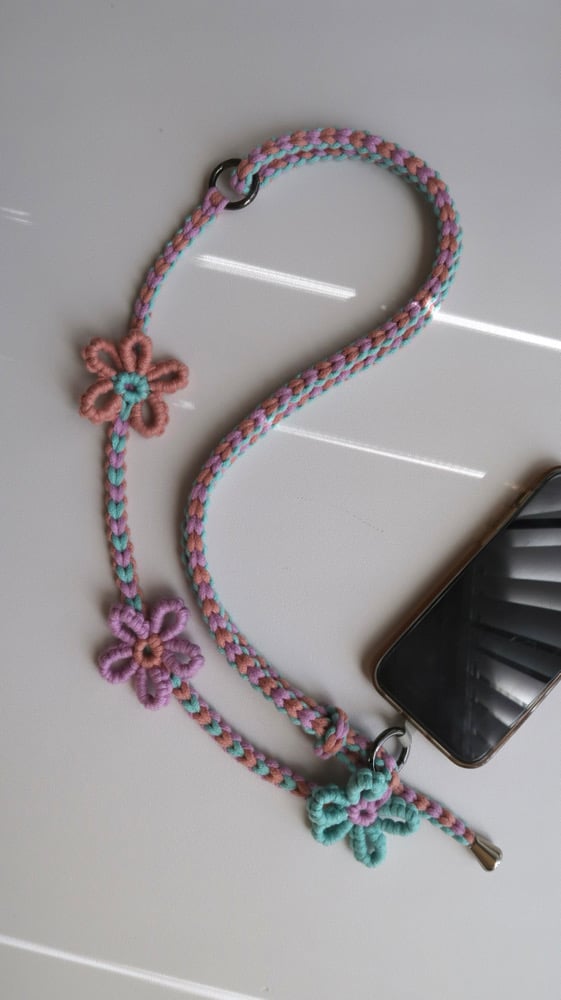 Keep your phone close and your style fresh with this handcrafted macrame phone strap + lanyard, featuring delicate flower & mini hearts pattern with adjustable length (95–150cm). Made from high-quality braided cotton cord, it's soft, durable, and perfect for everyday wear.